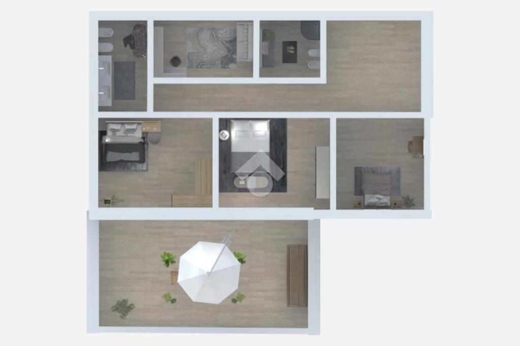 La zona notte, raggiungibile tramite scala interna, ospita quattro spaziose camere matrimoniali (una attualmente adibita a studio) e due bagni finestrati, uno con vasca e l’altro con doccia. Due delle camere dispongono inoltre di accesso diretto al terrazzo privato, che regala ulteriore luce e vivibilità agli ambienti.