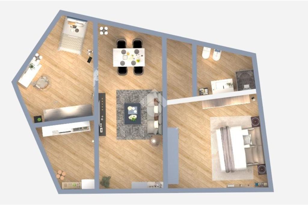 L’accesso all’abitazione avviene tramite un balcone esterno che conduce direttamente all’ingresso. La zona giorno si apre su un ampio salone, collegato funzionalmente alla cucina abitabile posta sulla sinistra.